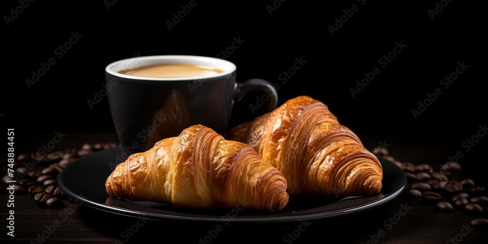 Fotografie Freshly baked croissants and cup of coffee on wooden table