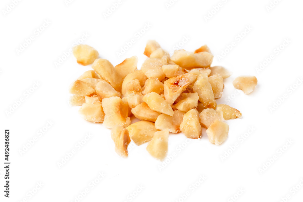 Fotografie Freshly chopped Hazelnuts as detailed close up shot isolated on white background