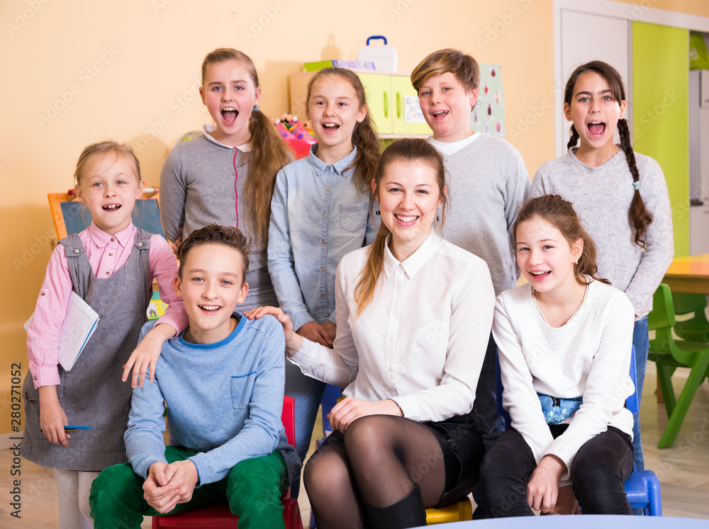 Obraz na plátně Friendly group of pupils with teacher in schoolroom