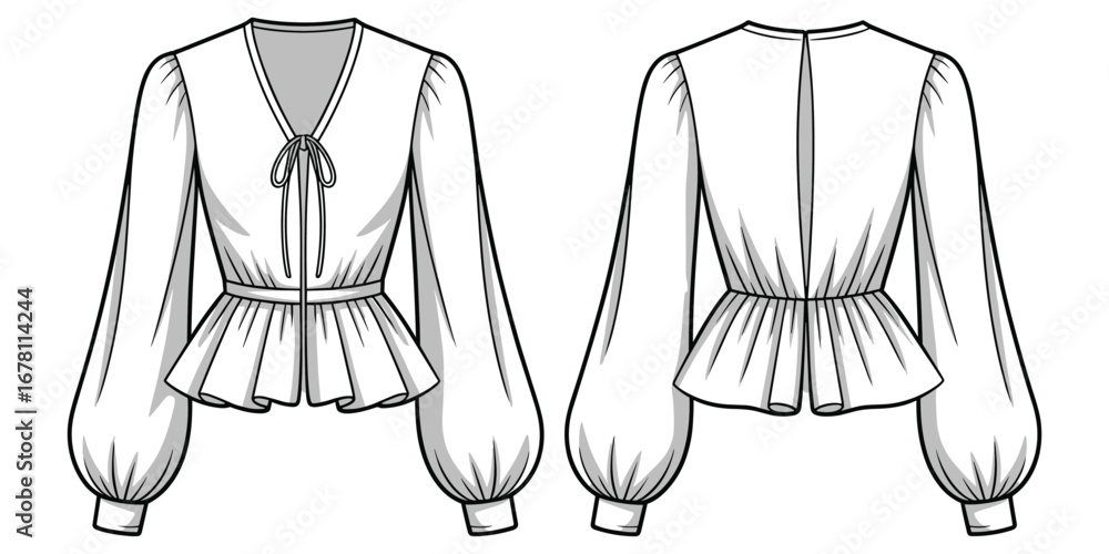 Obraz na plátně Front and back view of a white peasant blouse with tie neck and balloon sleeves