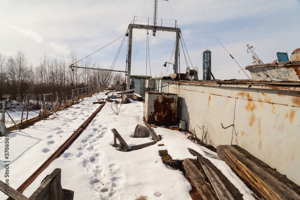 Obraz na plátně Frozen upper deck of an abandoned rusty ship