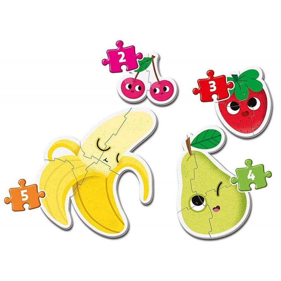 Čtyři velké ovocné puzzle pro nejmenší: 2, 3, 4 a 5 dílků. Velké, 3 mm silné dílky se malým ručkám dobře drží a hladce do sebe zapadají - ideální pro první skládání. Jasné, syté barvy usnadňují třídění a orientaci v obrázku, děti si trénují jemnou motoriku, koordinaci oko–ruka i soustředění. Baleno v robustní, elegantní krabici.