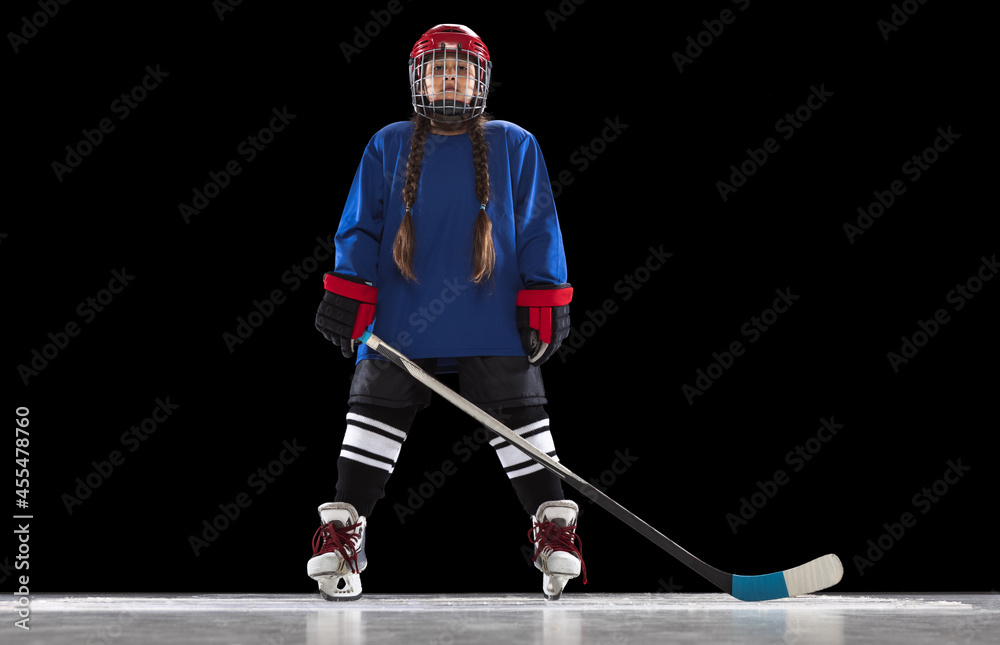 Fotografie Full-length portrait of young girl playing hockey isolated over black background