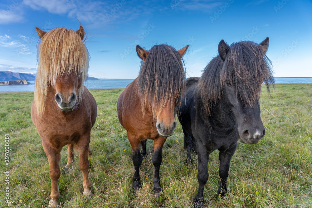 Obraz na plátně funny iceland ponies with a stylish haircut grazing on a pasture in northern Ice