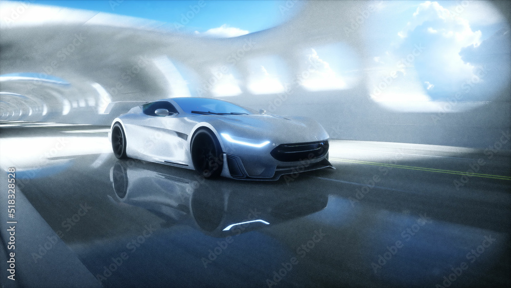 Fotografie Futuristic sci fi tunnel. futuristic sport car. 3d rendering.