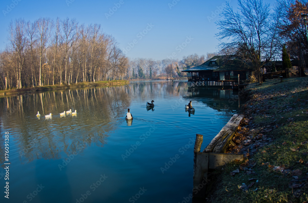Fotografie Geese on a small lake at sunny morning near Belgrade, Serbia