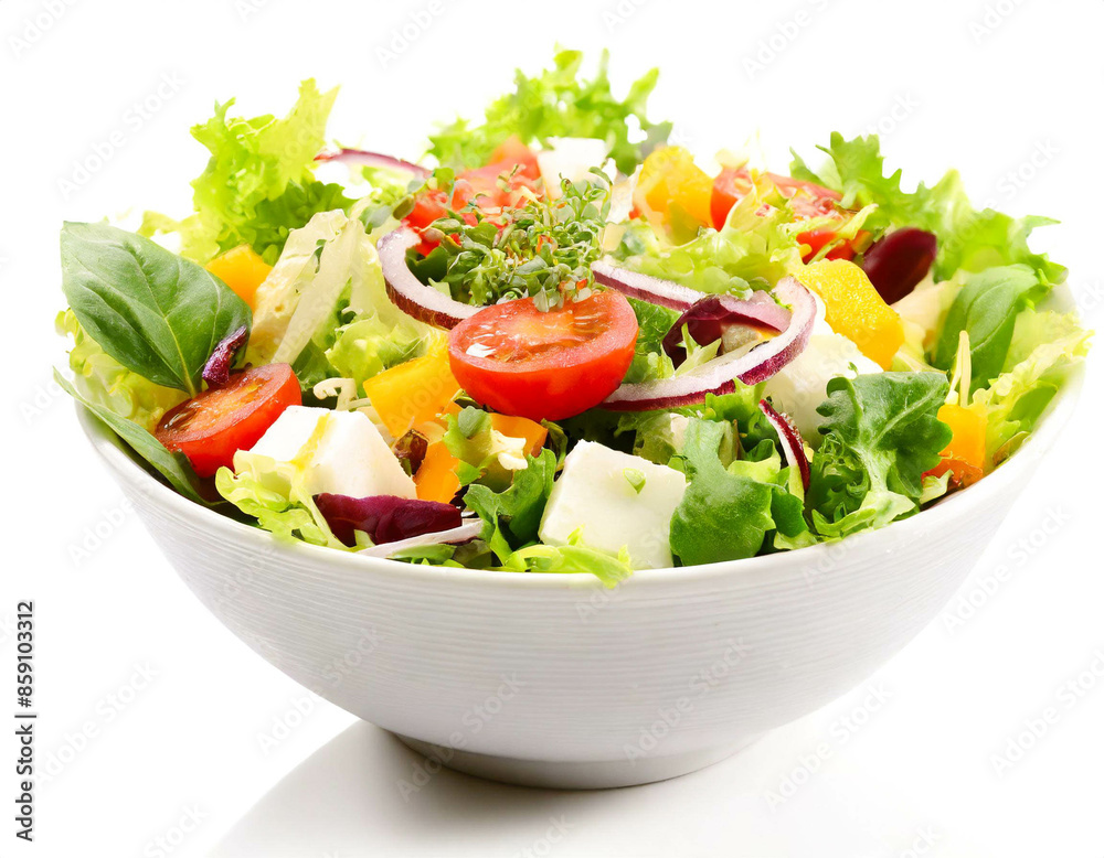 Fotografie gemischter Salat in Schüssel isoliert auf weißen Hintergrund, Freisteller