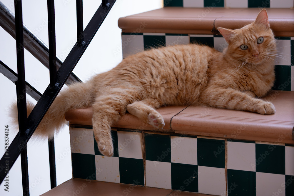Fotografie Ginger cat laying down stairs stray tomcat