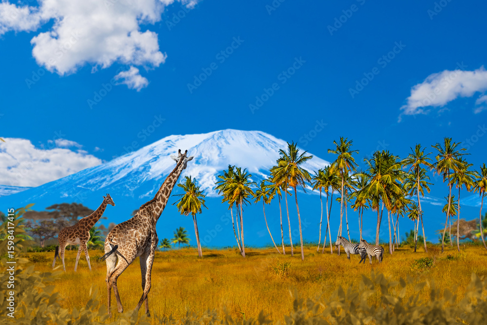Fotografie Giraffes and zebras roam African savanna near palm trees with Mount Kilimanjaro in background under clear blue sky