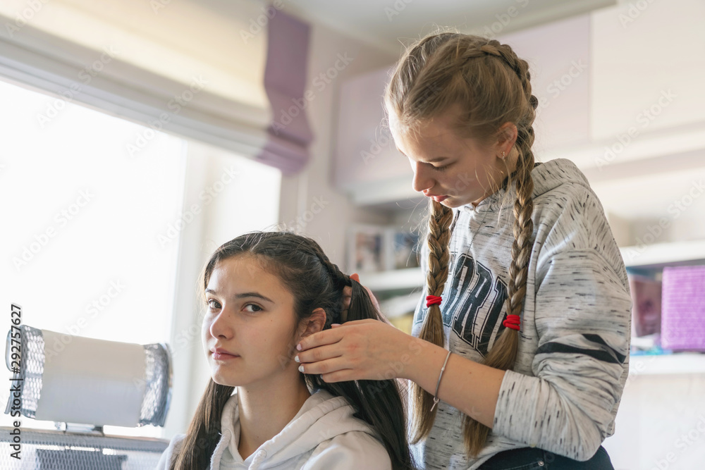 Fotografie Girl braiding friend's hair in pigtail hairstyle sits on chair in room in front