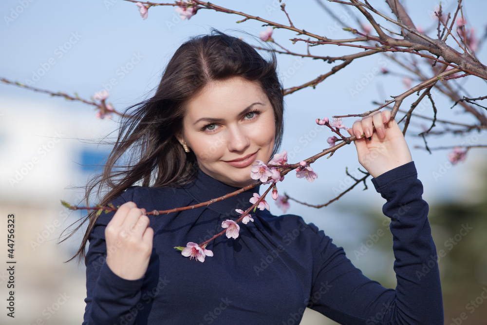 Fotografie Girl posing with blossoming peach-tree looking at camera smiling