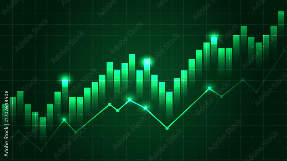 Fotografie Glowing green financial chart with rising bar graph and line graph on dark grid