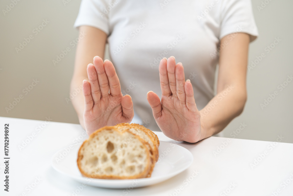 Fotografie Gluten allergy, asian young woman hand push out, refusing to eat white bread slice on plate in breakfast food meal at home, girl having a stomach ache