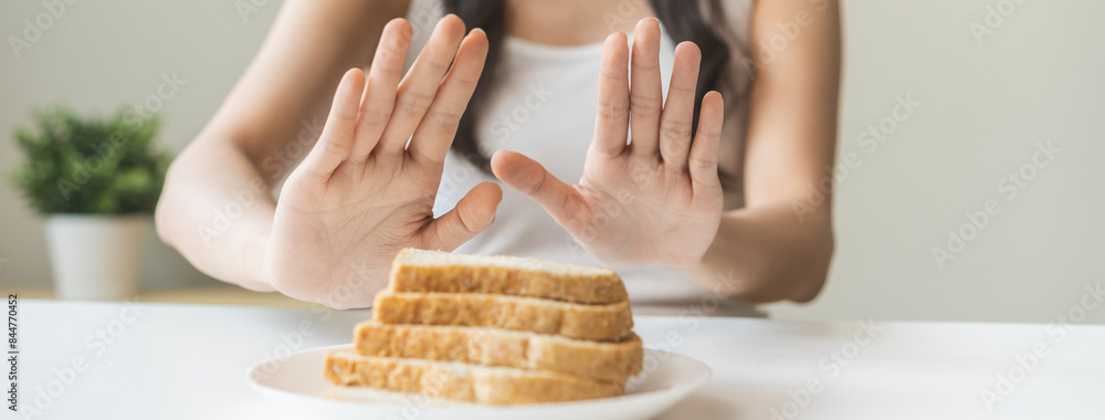 Fotografie Gluten allergy, asian young woman hand push out, refusing to eat white bread slice on plate in breakfast food meal at home, girl having a stomach ache