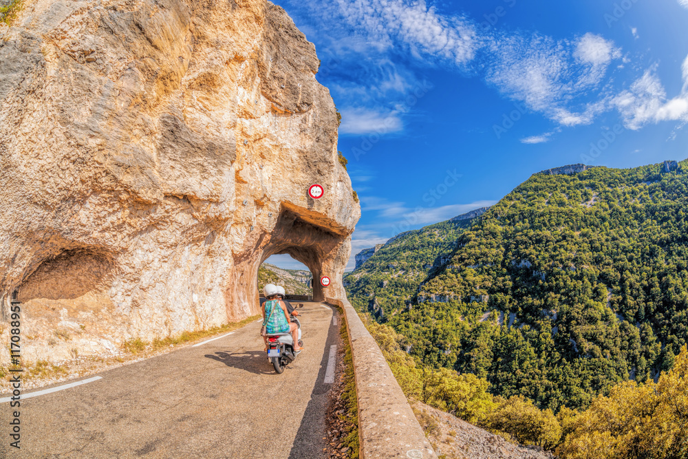 Fotografie Gorges de la Nesque, road tunnel with scooter in Luberon national park, Provence