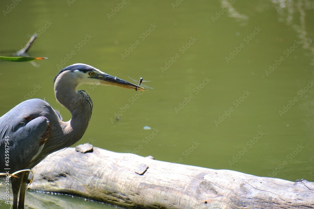 Fotografie great blue heron eating a dragonfly.