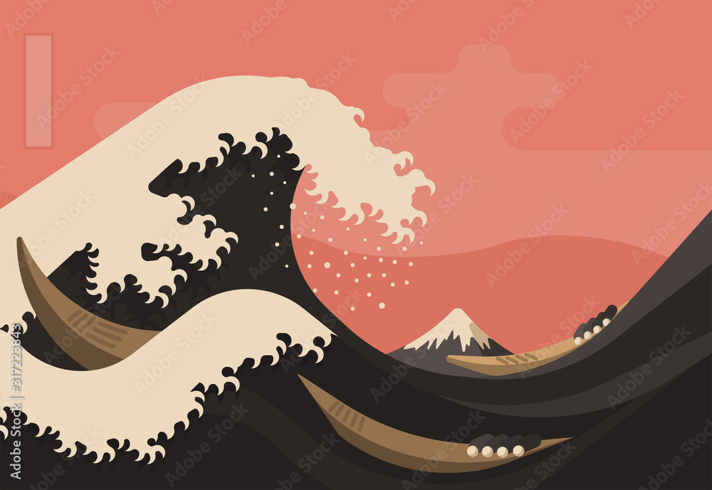 Fotografie Great Wave with Mount Fuji 19th century japanese style woodblock print vector illustration - Vector