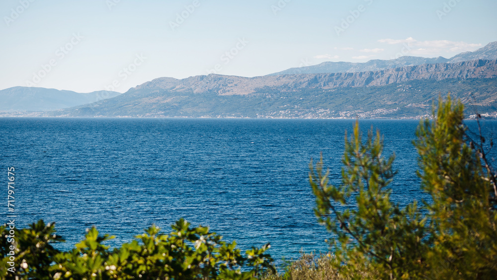 Fotografie Green tree tops with panoramic view on coast of Brac island