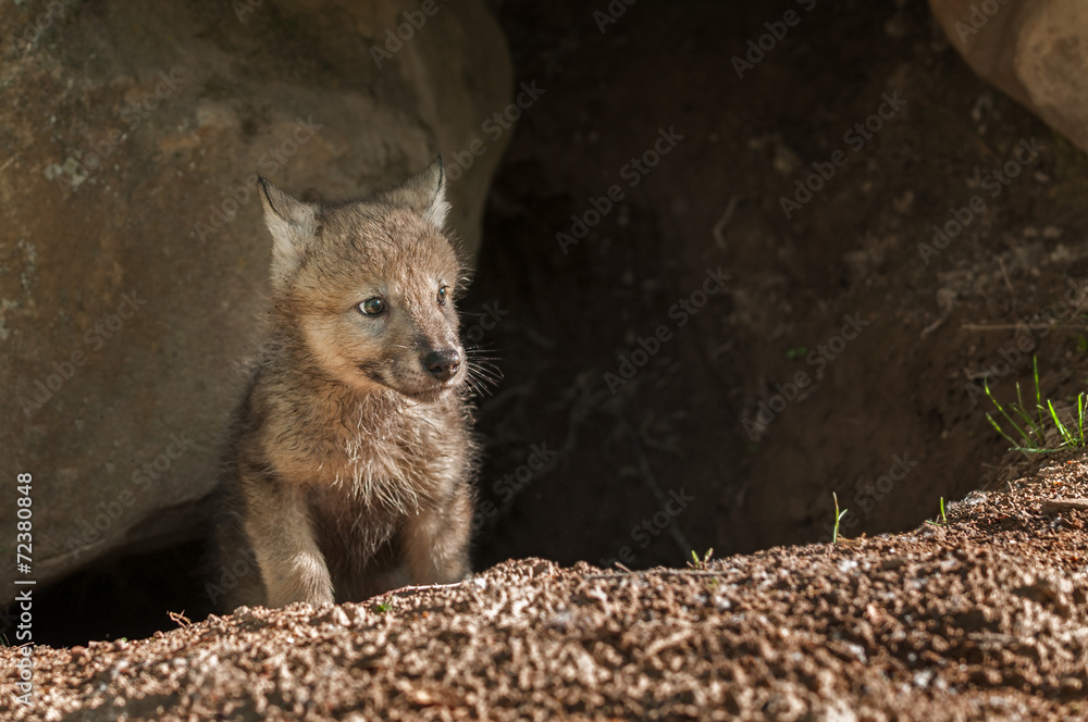 Obraz na plátně Grey Wolf (Canis lupus) Pup Pokes Head out of Den