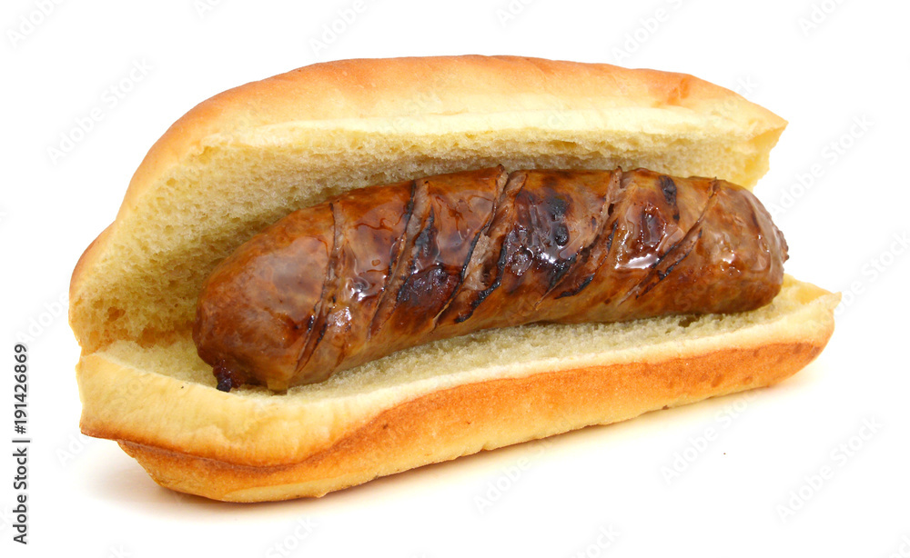 Fotografie Grilled bratwurst on a bun isolated on white