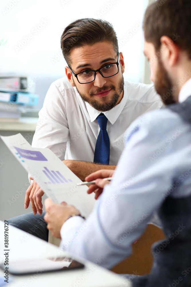 Fotografie Group of businessmen with financial graph and silver pen in arm solve and discuss problem with colleague portrait