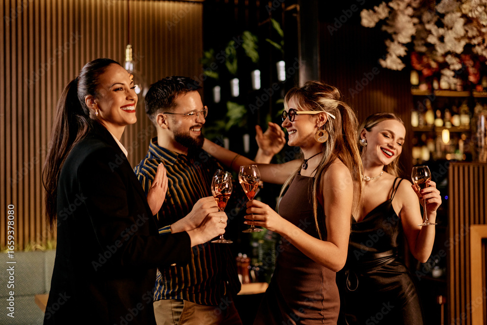 Fotografie Group of Friends Enjoying Drinks and Conversation at a Stylish Indoor Gathering