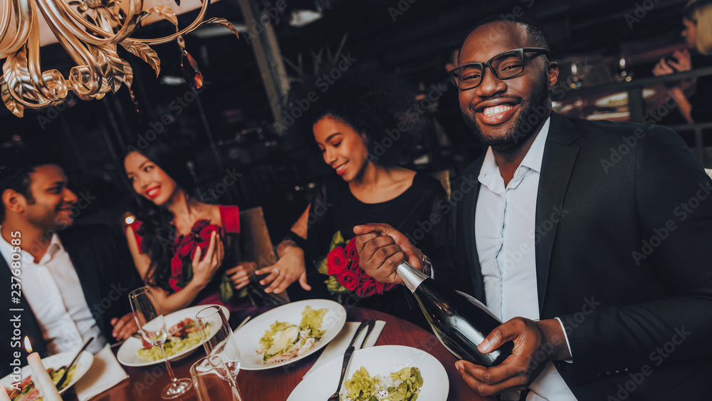 Fotografie Group of Happy Friends Meeting and Having Dinner