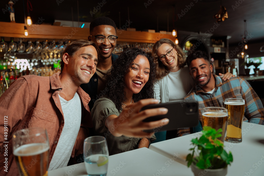 Fotografie Group of young adult friends eating dinner at restaurant taking selfies
