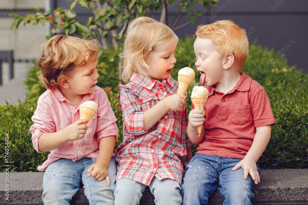 Fotografie Group portrait of three white Caucasian cute adorable funny children toddlers sitting together sharing ice-cream food
