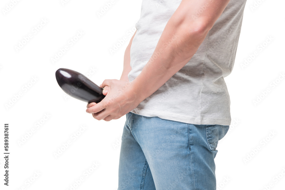 Fotografie Guy crop view holding eggplant at crotch level imitating penis erection isolated