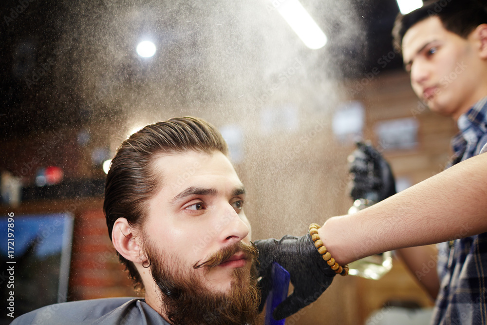 Obraz na plátně Hair master spraying hair-styling product on client hair