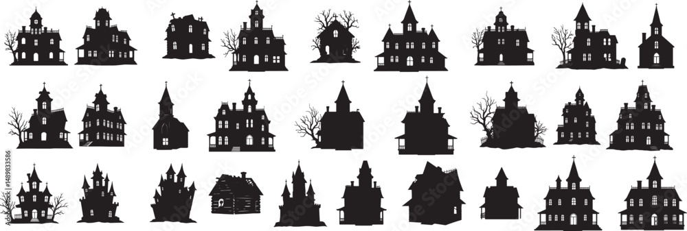 Obraz na plátně Halloween haunted houses silhouette vector set spooky mansion creepy building sc