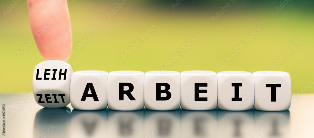 Obraz na plátně Hand dreht einen Würfel und ändert das Wort Leiharbeit in Zeitarbeit, oder umgekehrt