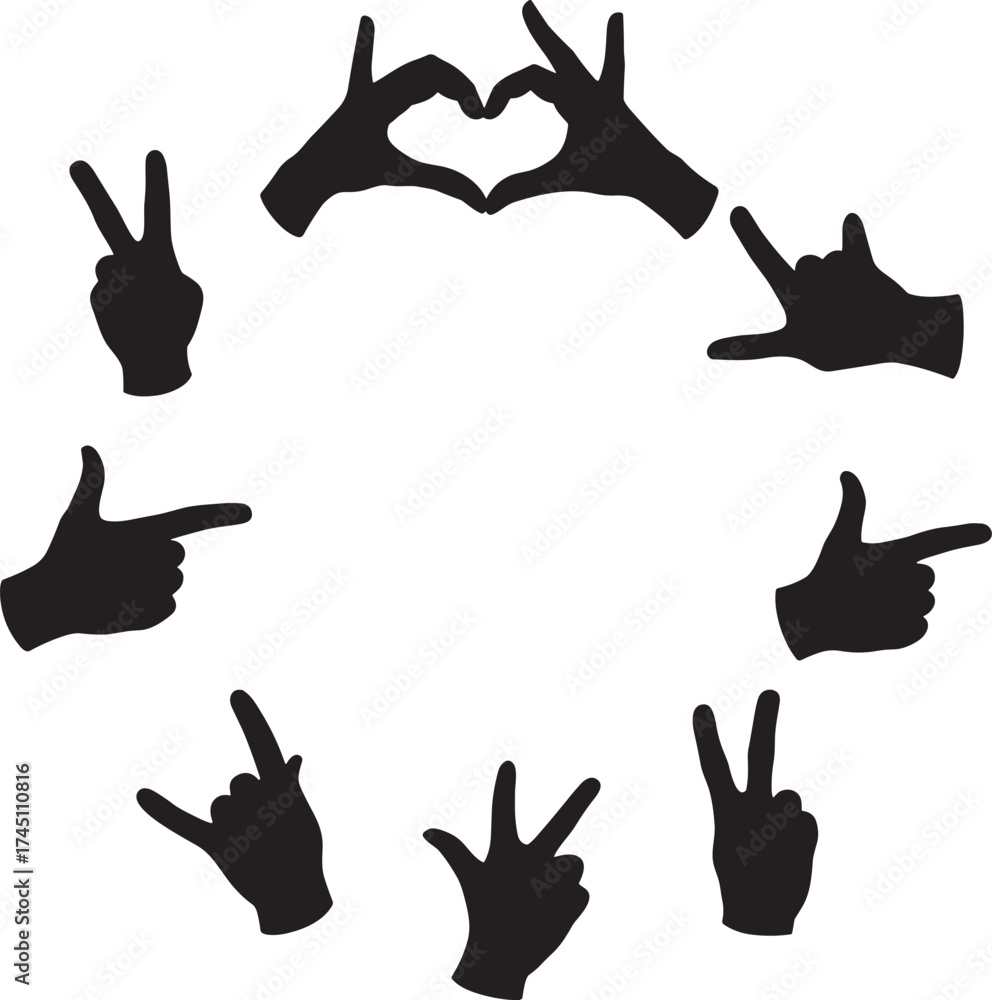 Fotografie Hand gesture silhouettes, black vector illustration, peace sign, heart hands, po