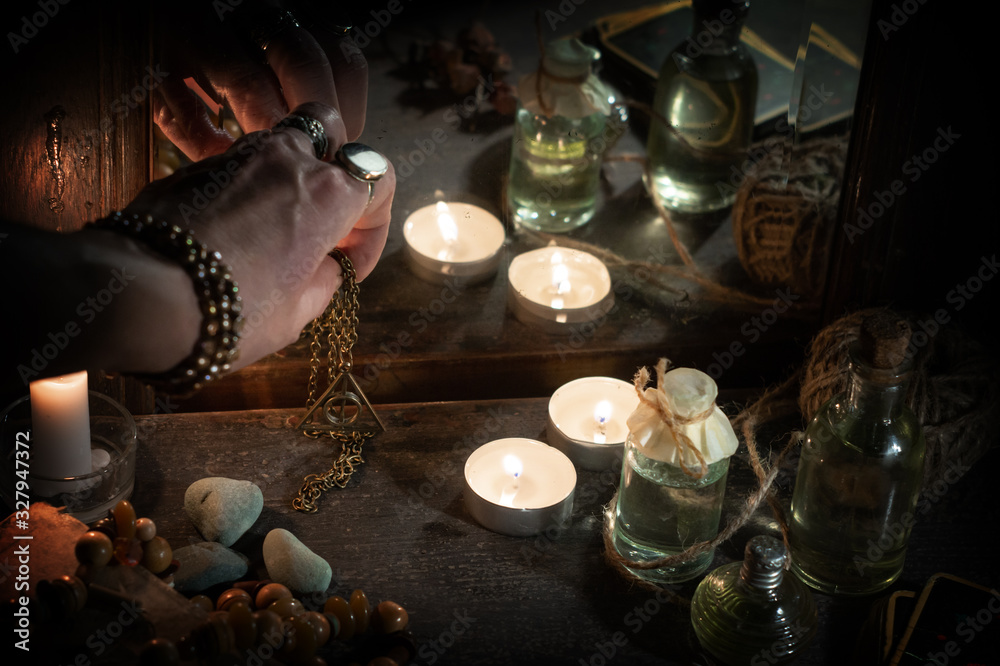 Fotografie Hand of fortuneteller with a magic symbol during spiritual session
