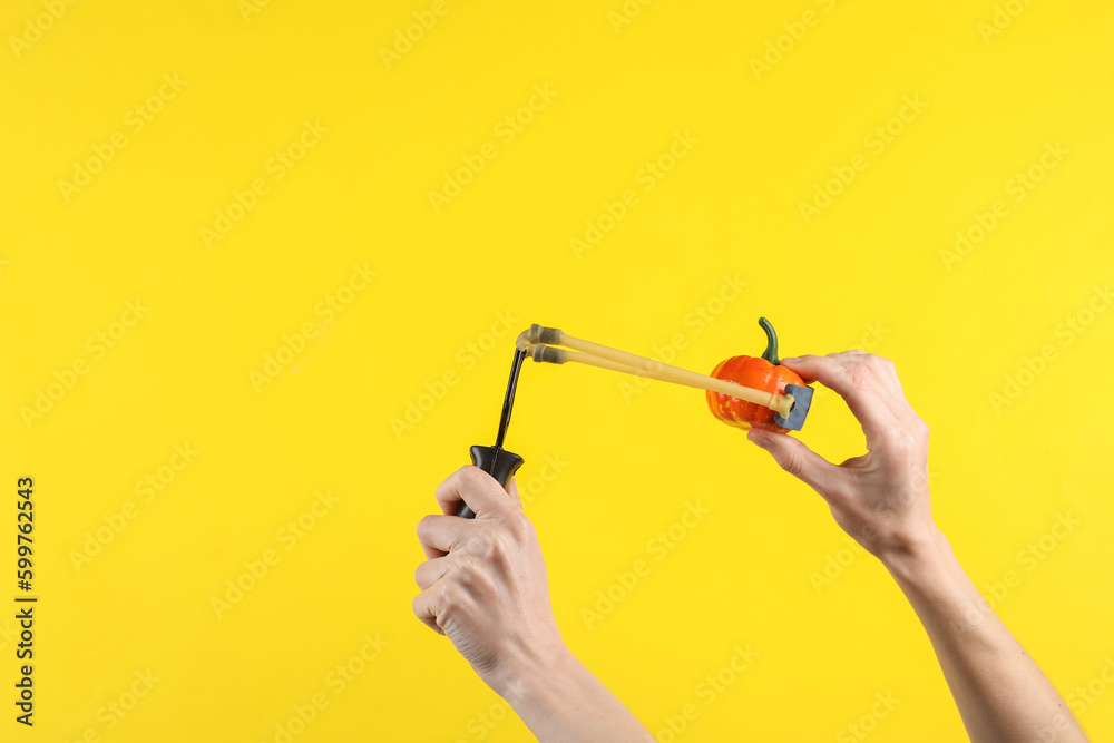 Fotografie Hands holding slingshot with toy pumpkin on a yellow background