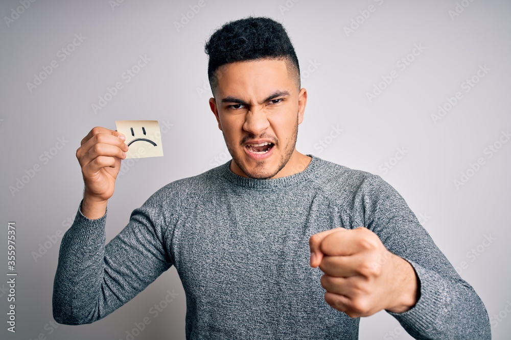 Obraz na plátně Handsome man holding reminder paper with sad emotion face emoji over white backg