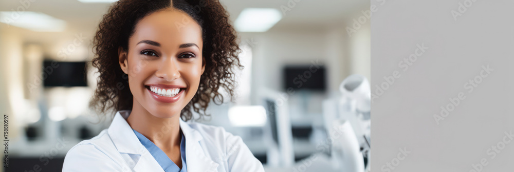 Fotografie Happy Female Doctor at a Hospital: A Smiling Medic Providing Professional Health