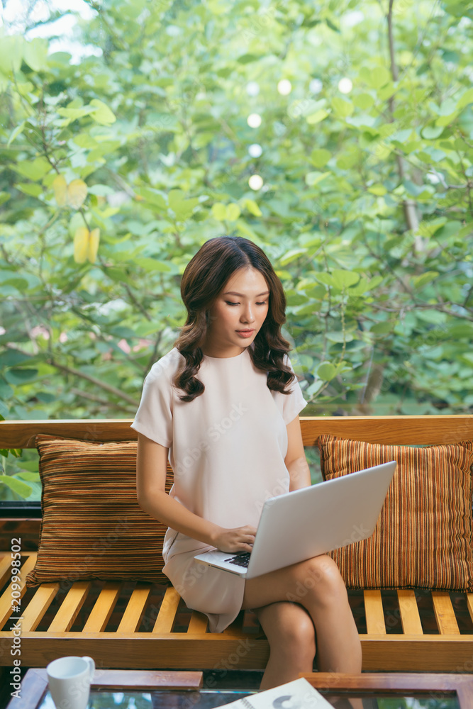 Fotografie Happy pretty young woman sitting on sofa and using laptop at home