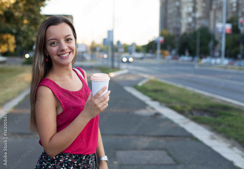 Fotografie Happy young woman drinking coffee on city street