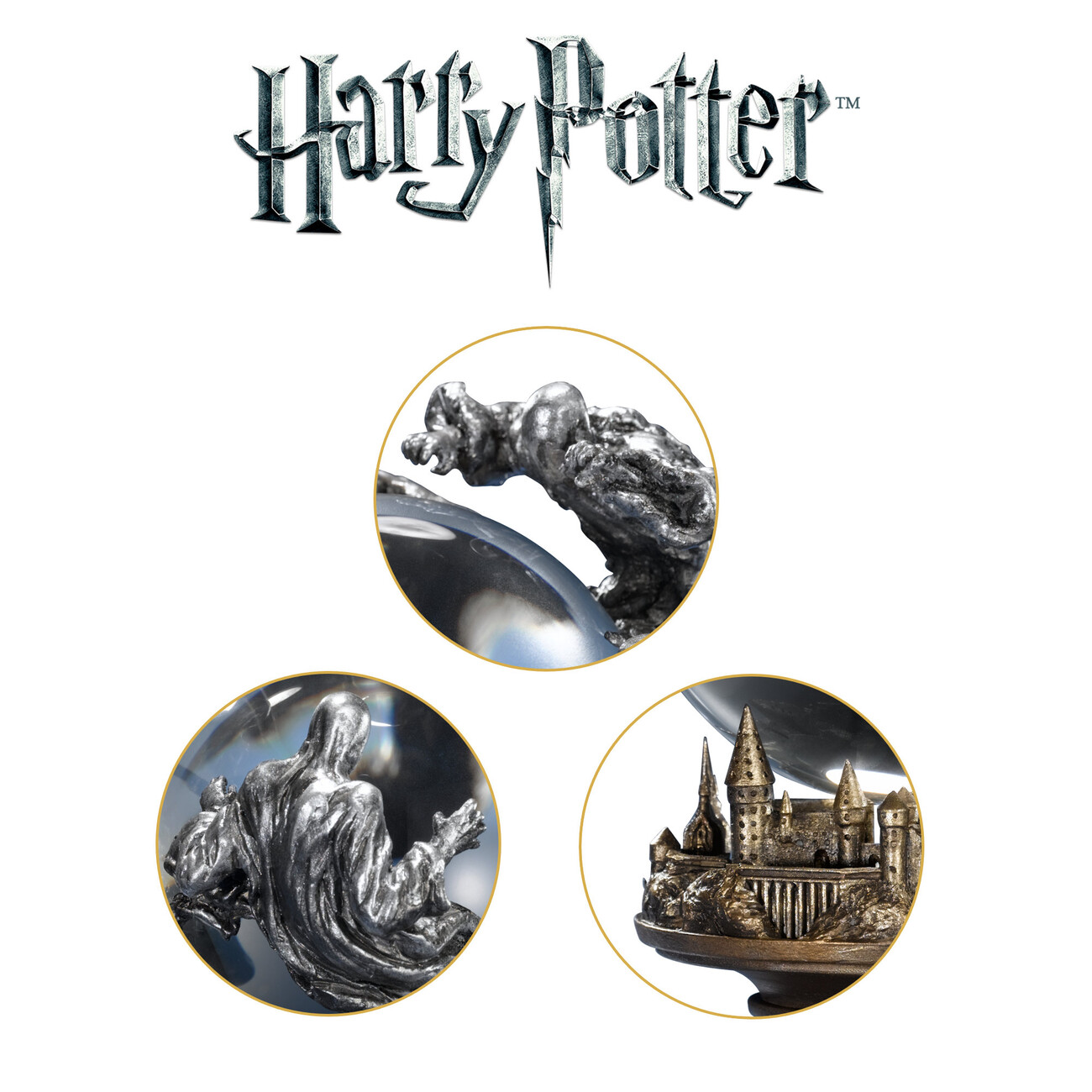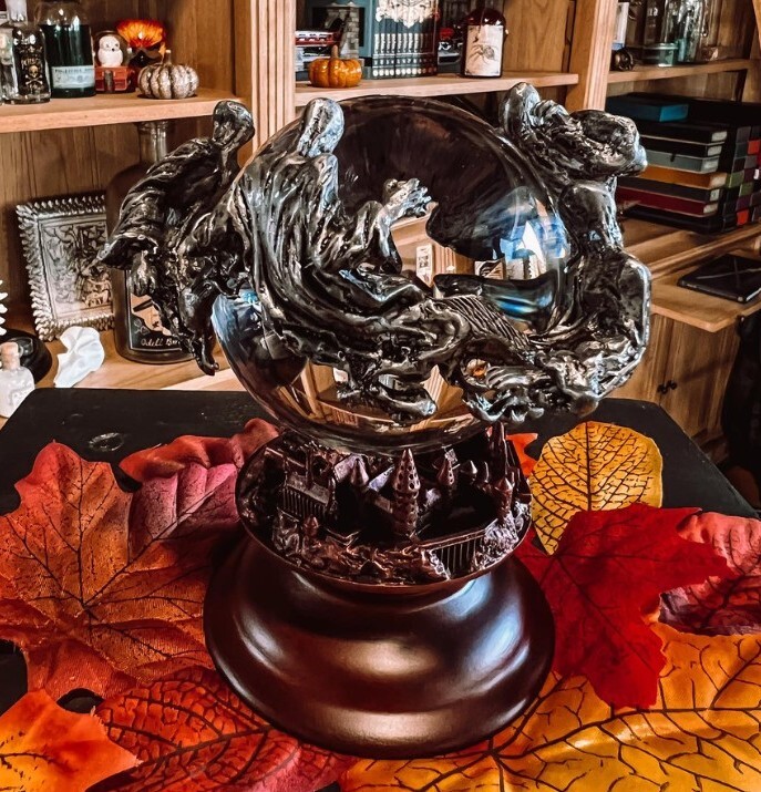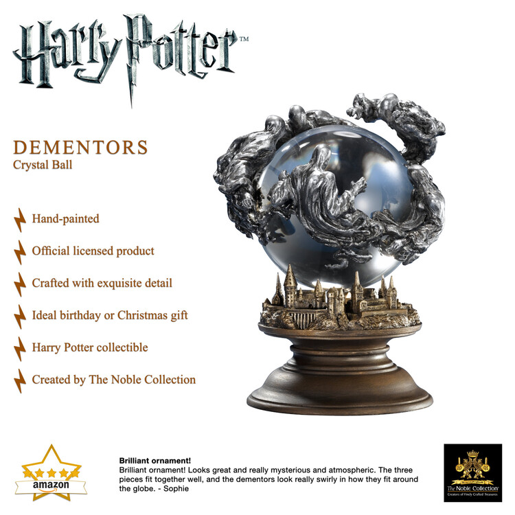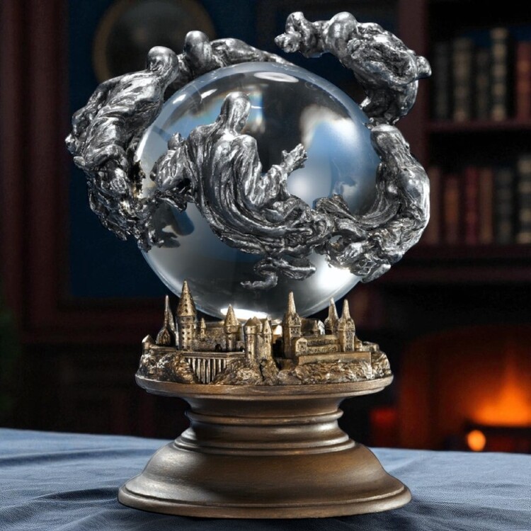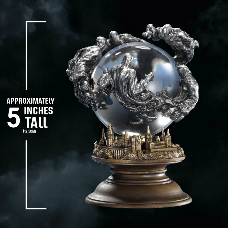 Křišťálová koule jako vystřižená z filmu Harry Potter a vězeň z Azkabanu! Spočívá na modelu Bradavic a obklopují ji děsiví mozkomorové z cínu. Výška cca 12,5 cm, materiál: sklo, dřevo a cín.
