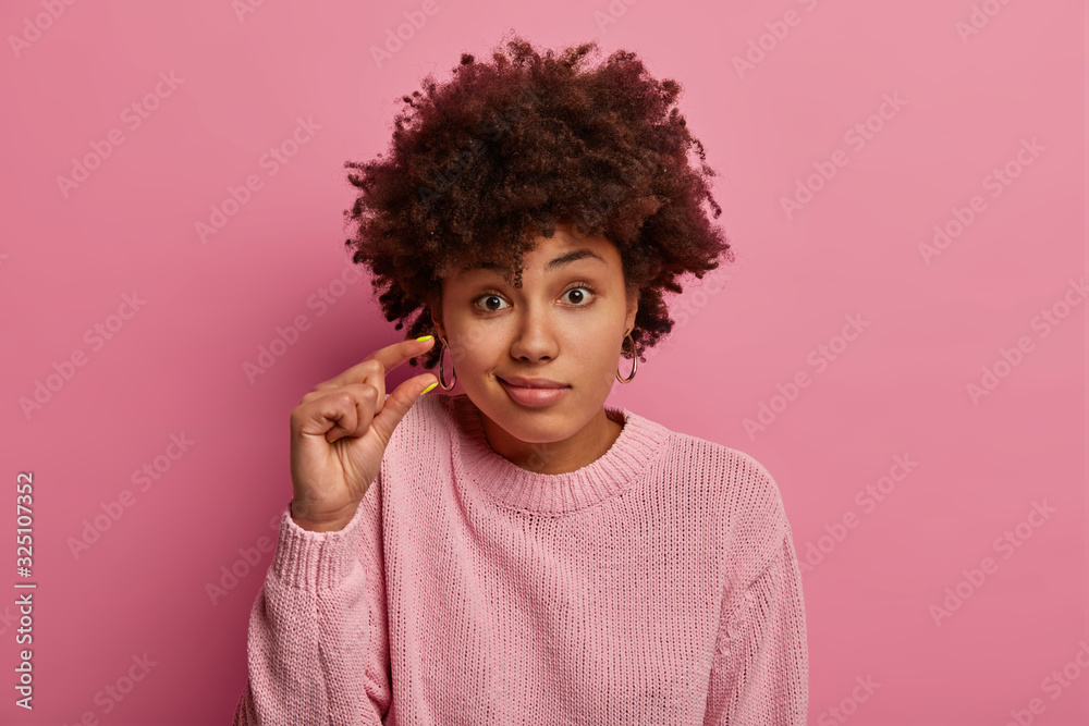 Fotografie Headshot of curly haired woman discusses something very small, shapes something