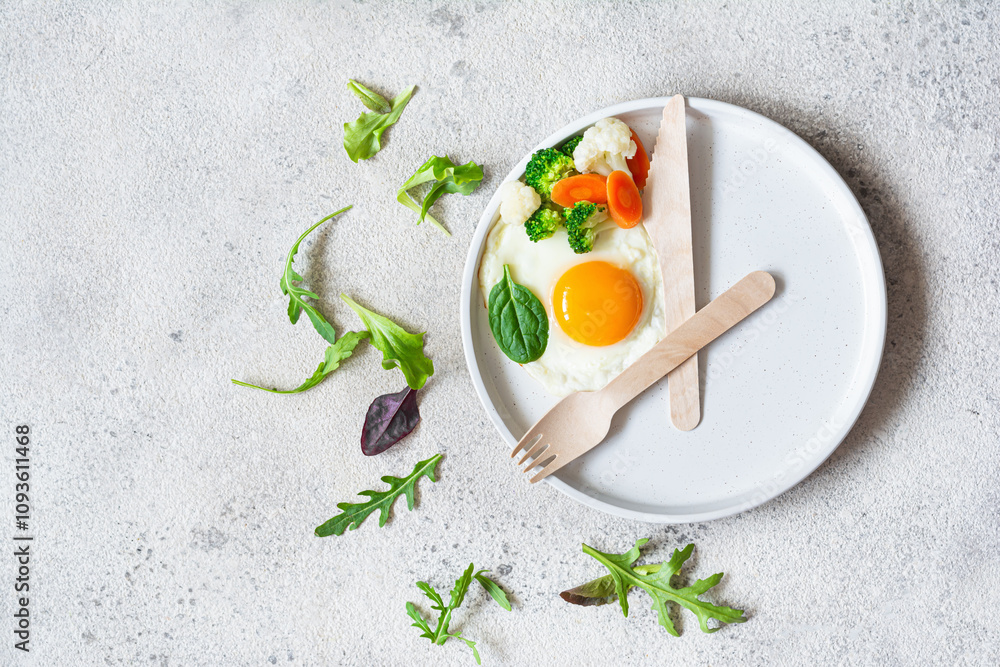 Fotografie Healthy breakfast of fried egg and boiled vegetables with spinach on a light background