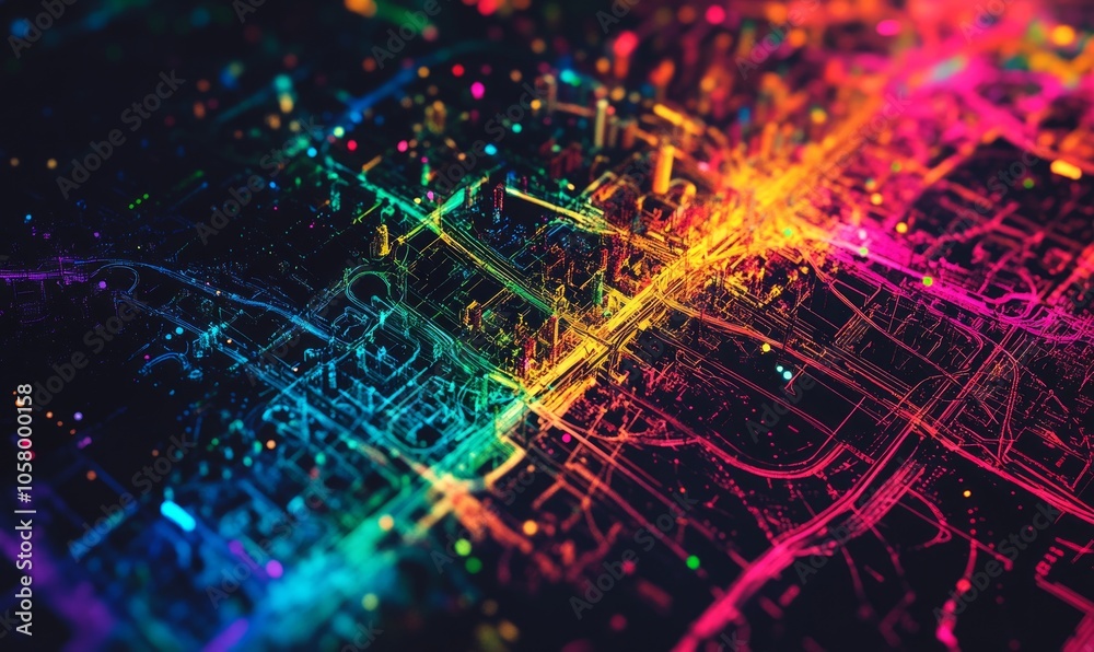 Fotografie Heatmap of a city's public transit system, with vibrant colors showing the most heavily used routes and stations, cooler tones in the less crowded areas