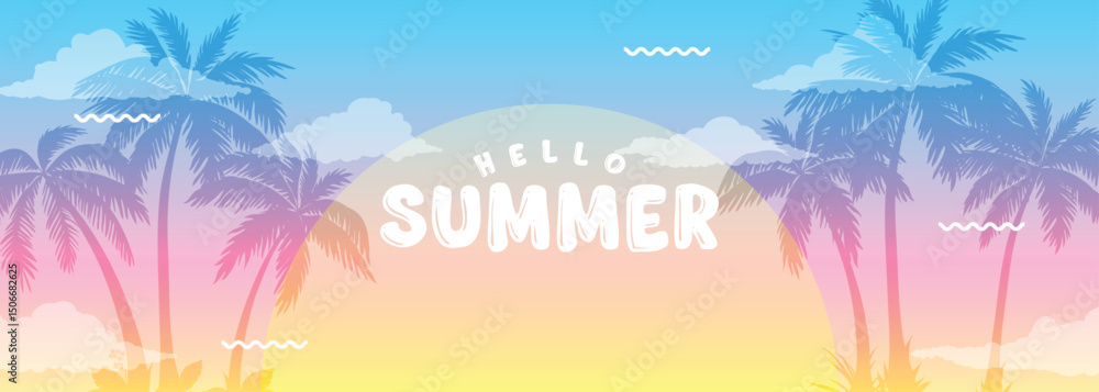 Fotografie Hello Summer: Vector Illustration with Palm Trees and Gradient Sky Background