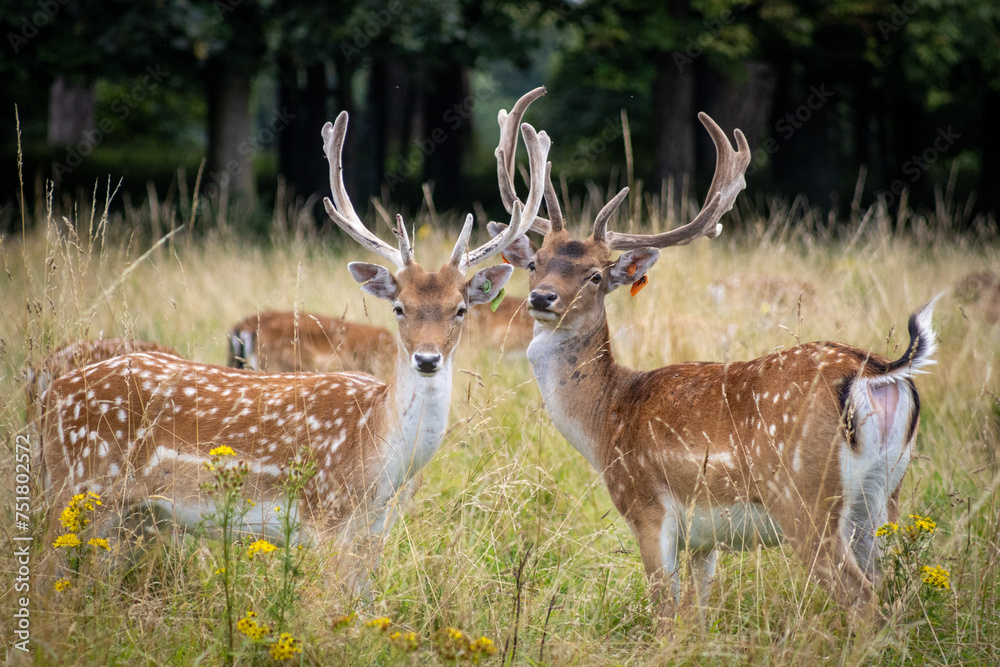 Fotografie Herd of young wild deer and with big crows running on fresh grass in Phoenix Park in Dublin, Ireland