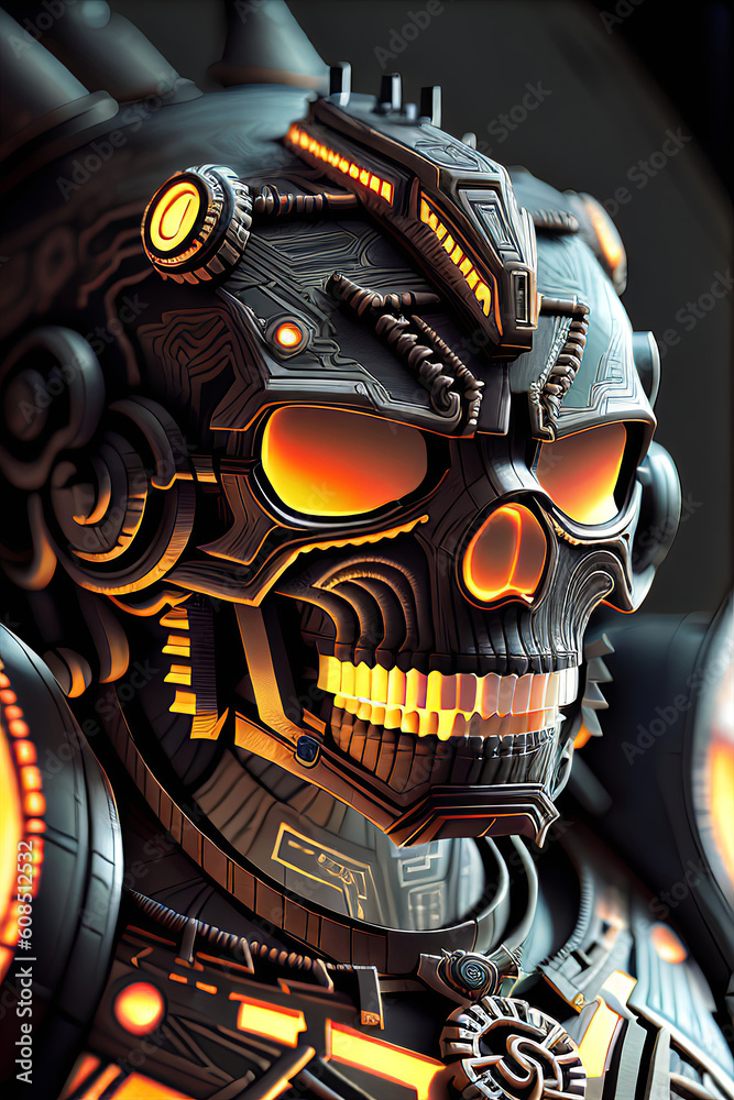 Fotografie High Detailed Black Metal Sci-Fi Armor with Orange Glowing Eyes Generative AI il
