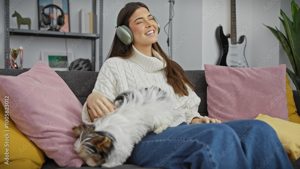 Fotografie Hispanic woman relaxing with her dog in a cozy living room, enjoying music through headphones