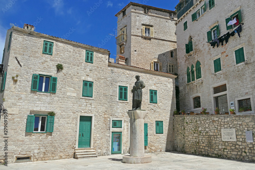 Fotografie Historic stone made houses with green windows, Sibenik, Croatia