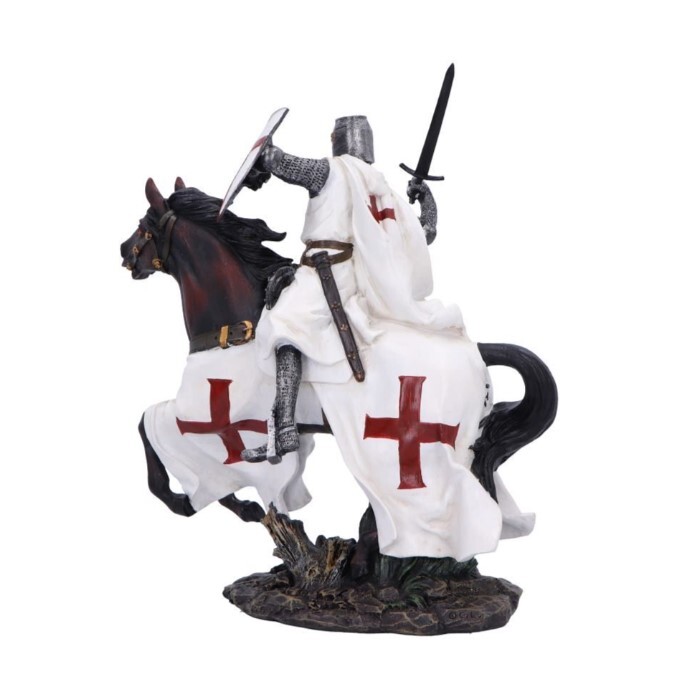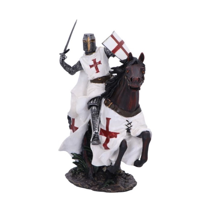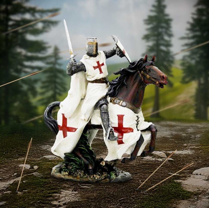 Figurka zobrazuje ikonický bílý plášť templářského rytíře, výrazně zdobený červeným křížem. Pečlivě odlitá z vysoce kvalitní pryskyřice a ručně malovaná s důrazem na detail – od dynamické pózy koně až po propracované brnění a výzbroj rytíře – každý prvek této sošky doslova ožívá řemeslným mistrovstvím.
